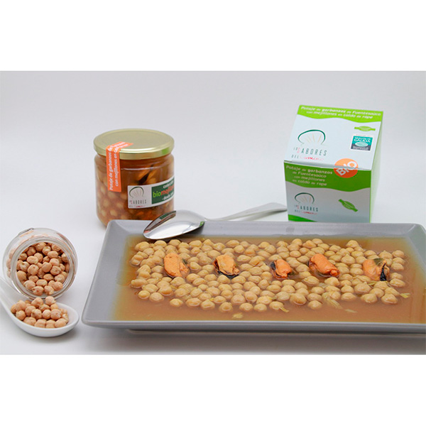 Ingredientes: garbanzos* de Fuentesaúco IGP, mejillones* (Mytilus galloprovincialis) de la ría de Arousa, caldo de rape (rape 3% y agua), tomate*, puerro* fresco, AOVE* Cobransosa, laurel* y sal.